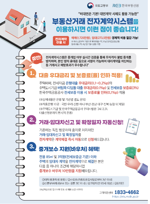 - 경제적 혜택이 많음- 전자계약을 통해 부동산 거래를 할 경우, 대출 우대금리 적용, 등기대행 수수료 할인, 전세보증금 반환보증 수수료 인하 등 다양한 혜택을 받을 수 있음